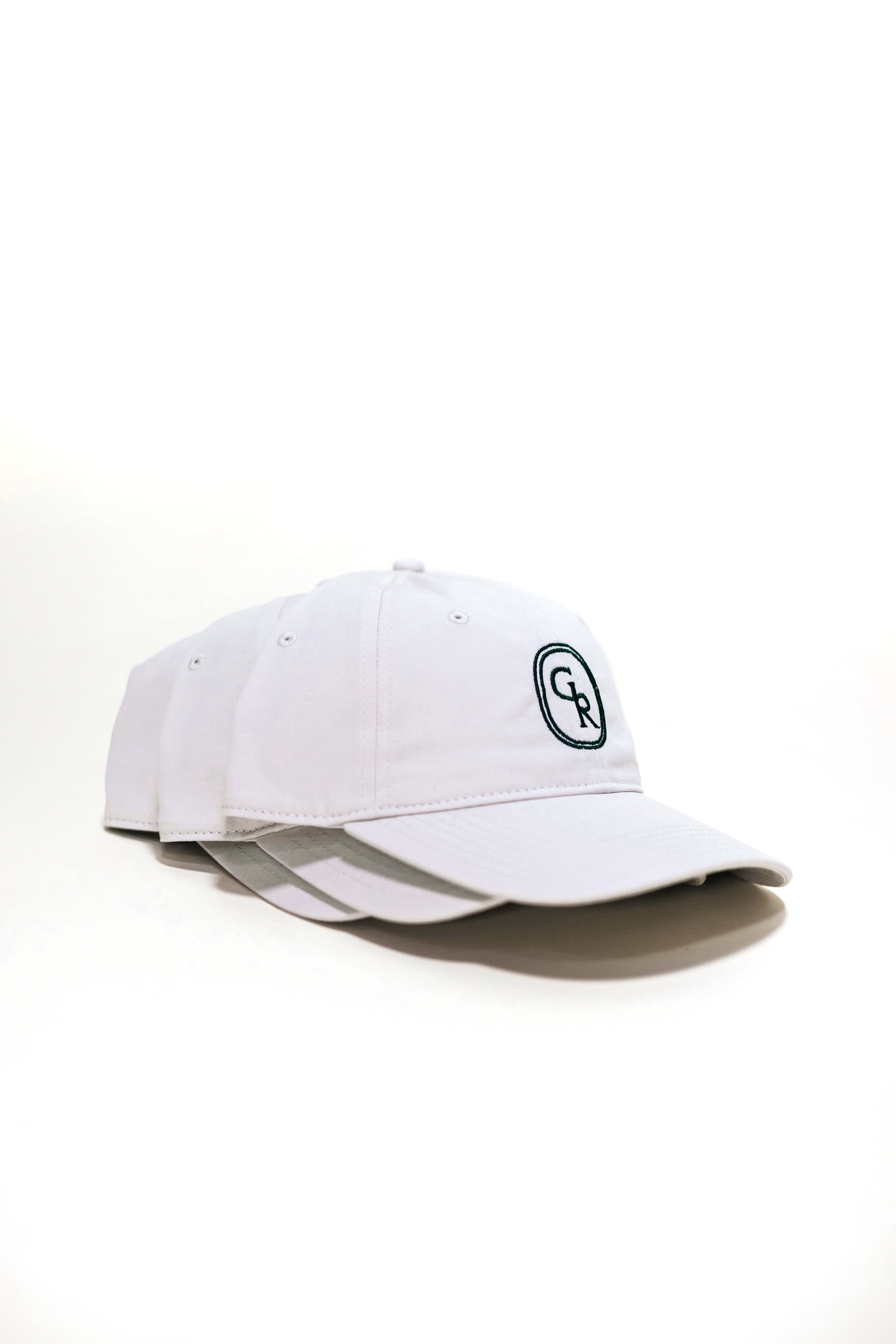 crisp white cotton twill with a forest green “GR” monogram, six-panel construction, adjustable strapback. Clean, classic, and garden-party ready. One size fits most.